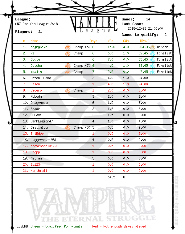 You can follow progress in this thread and eventually here: www.vtes-hook.com/liga/liga_liste.php